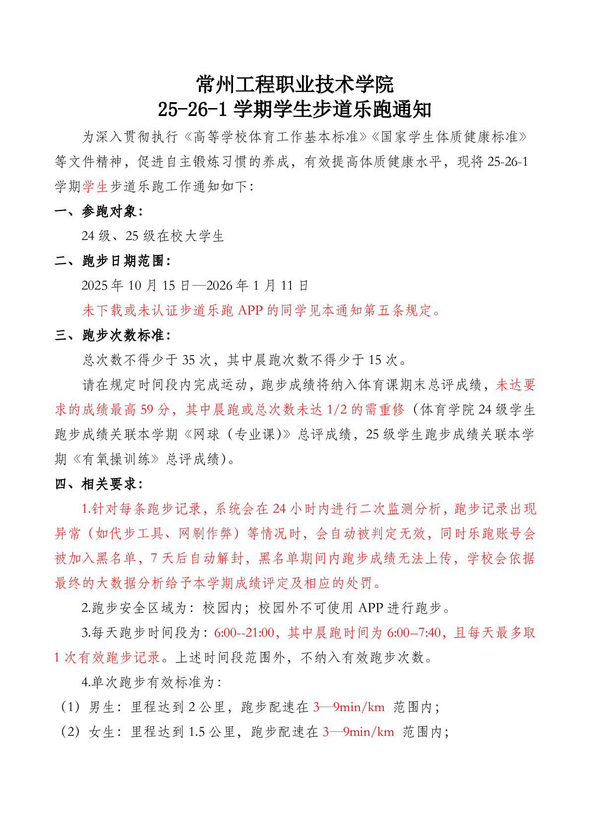 常州工程职业技术学院 25-26-1学期学生步道乐跑通知