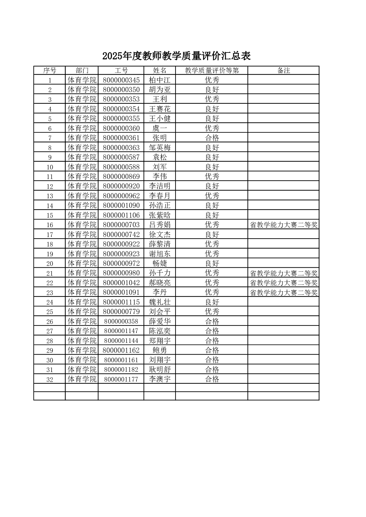 经体育学院党总支联席会研究决定,现将体育学院2025年度教师教学质量评价情况公示如下。公示时间:2026年1月22日至1月24日。如对公示结果有质疑,请向体育学院纪检委员李老师反映。联系人:李老师,13401350301。