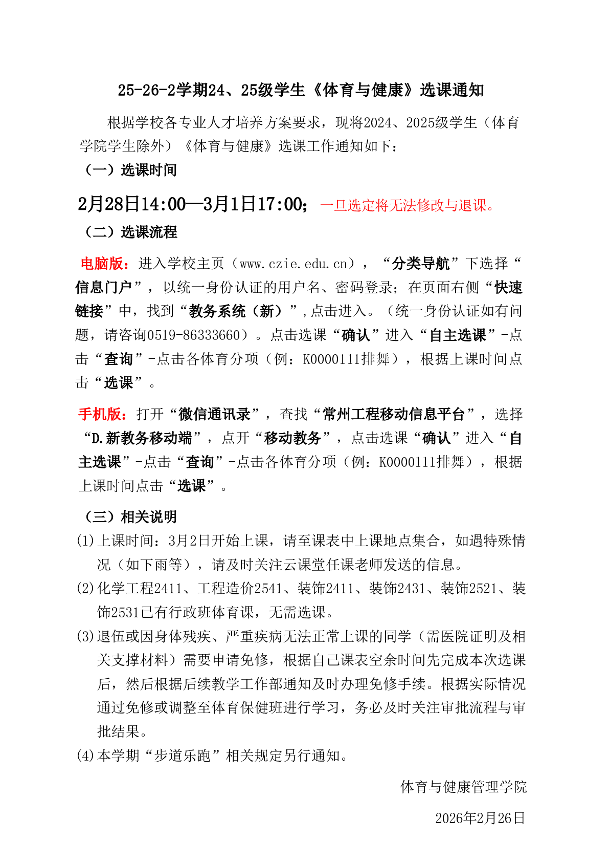 25-26-2学期24、25级学生《体育与健康》选课通知